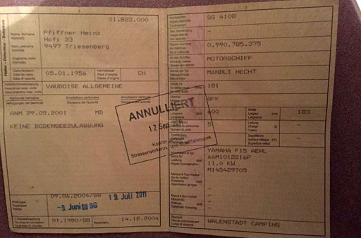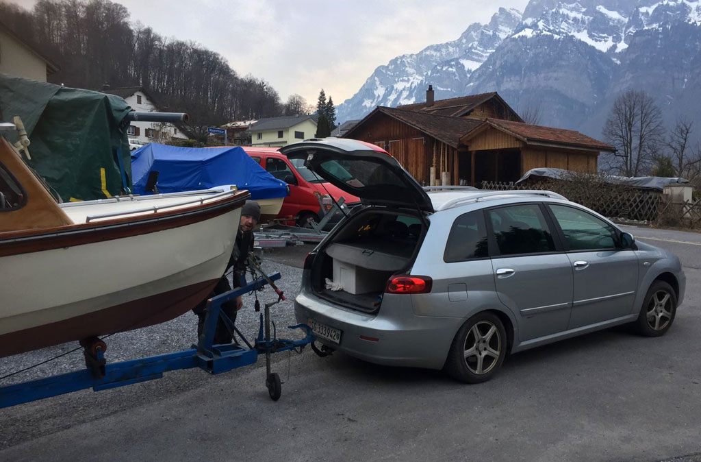 Das wartet auch schon in Balzers, doch bis es endlich zu Wasser gelassen werden kann ist noch einiges zu tun: Kaufvertrag, Transport organisieren, neuen passenden Motor besorgen und einbauen lassen, Zulassung und Seepatent organisieren, Liegeplatz organisieren und und und ...