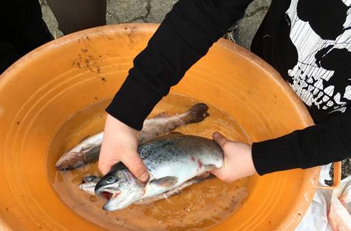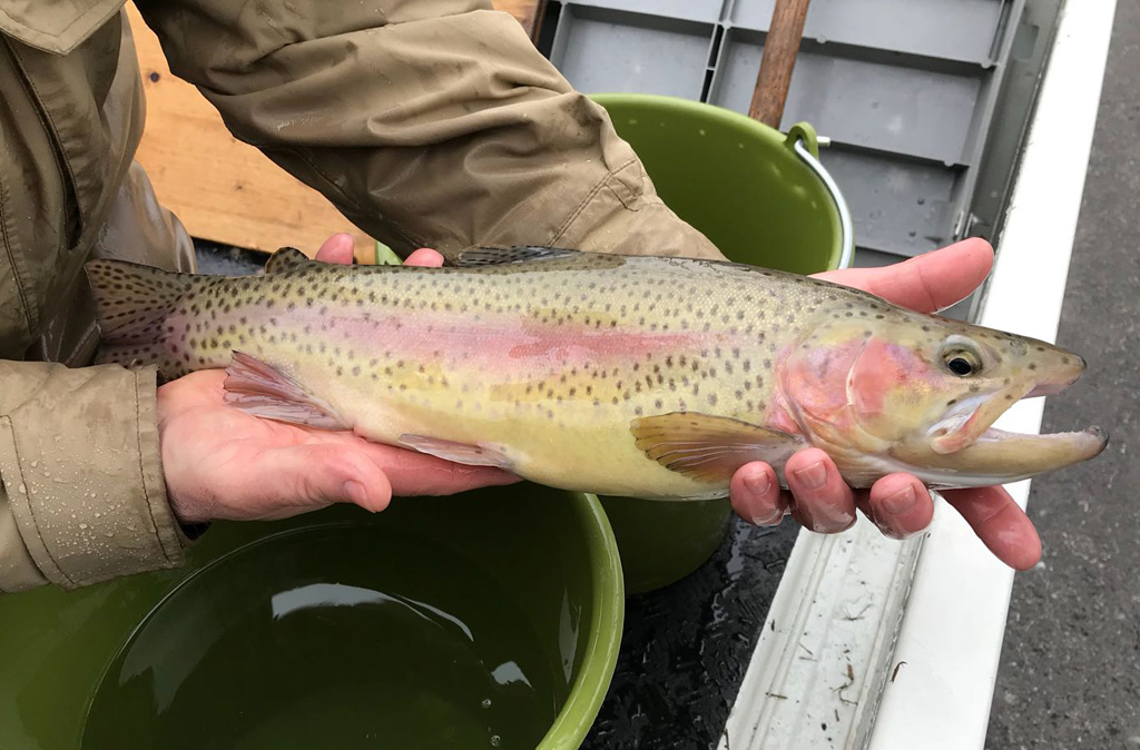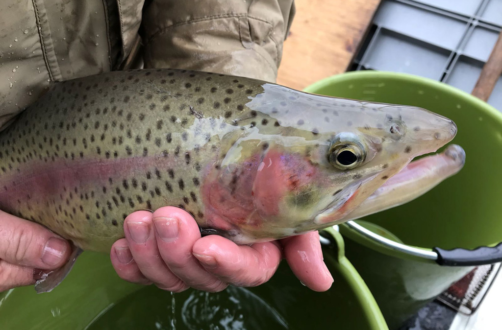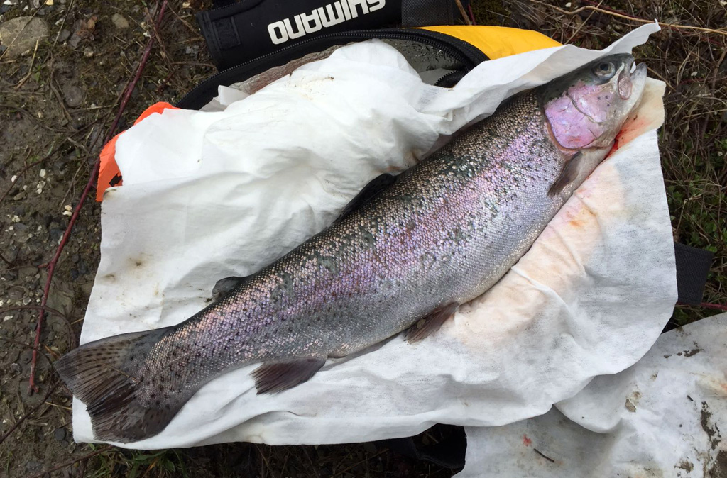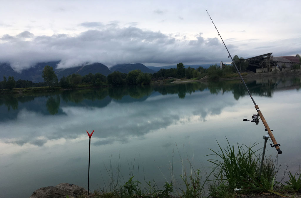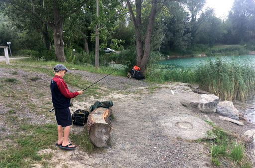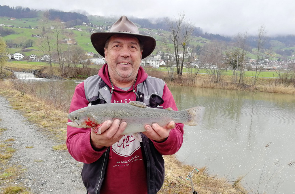 Da geht´s gleich bei wunderschönem Wetter an den Gamser Weiher, wo auch tatsächlich eine stattliche Regenbogenforelle mit 46 cm beisst - ja, so lässt es sich angeln!