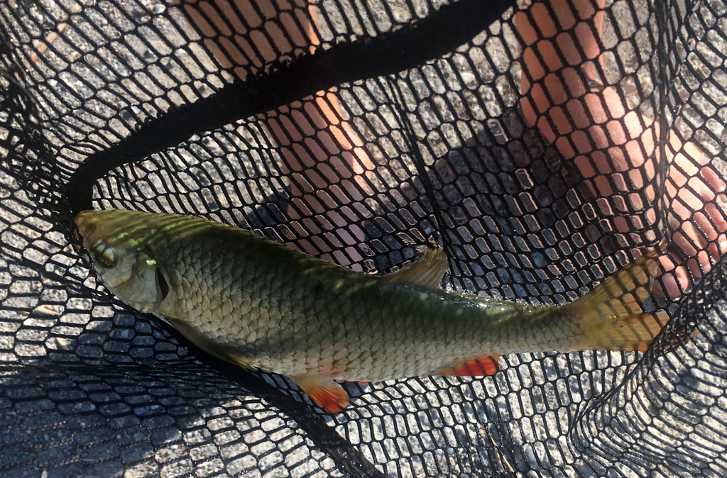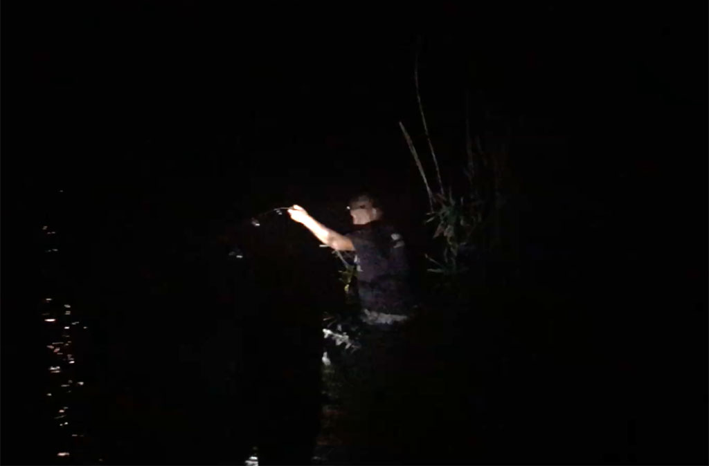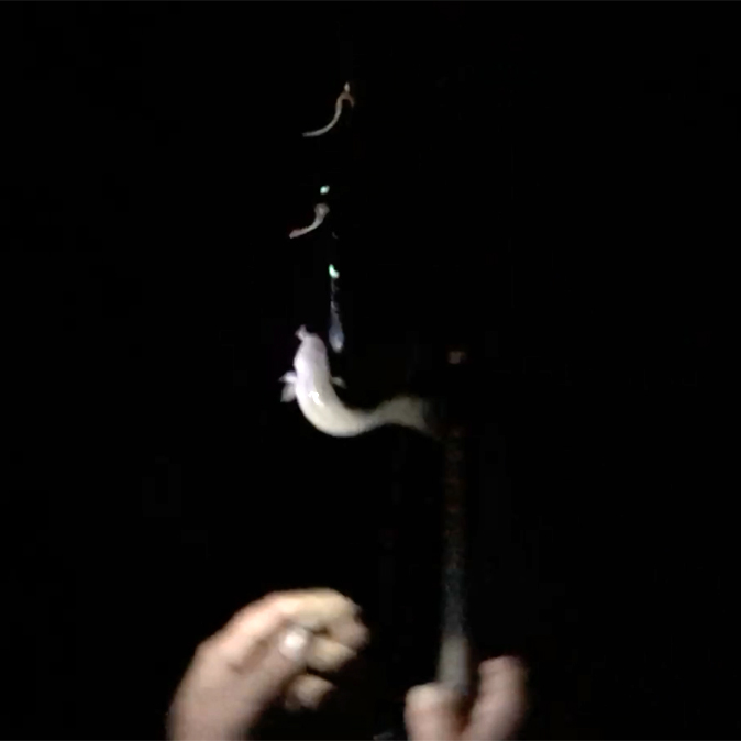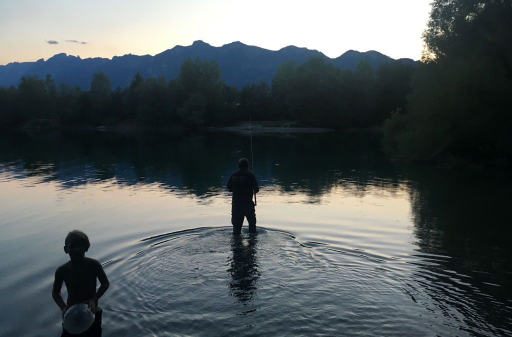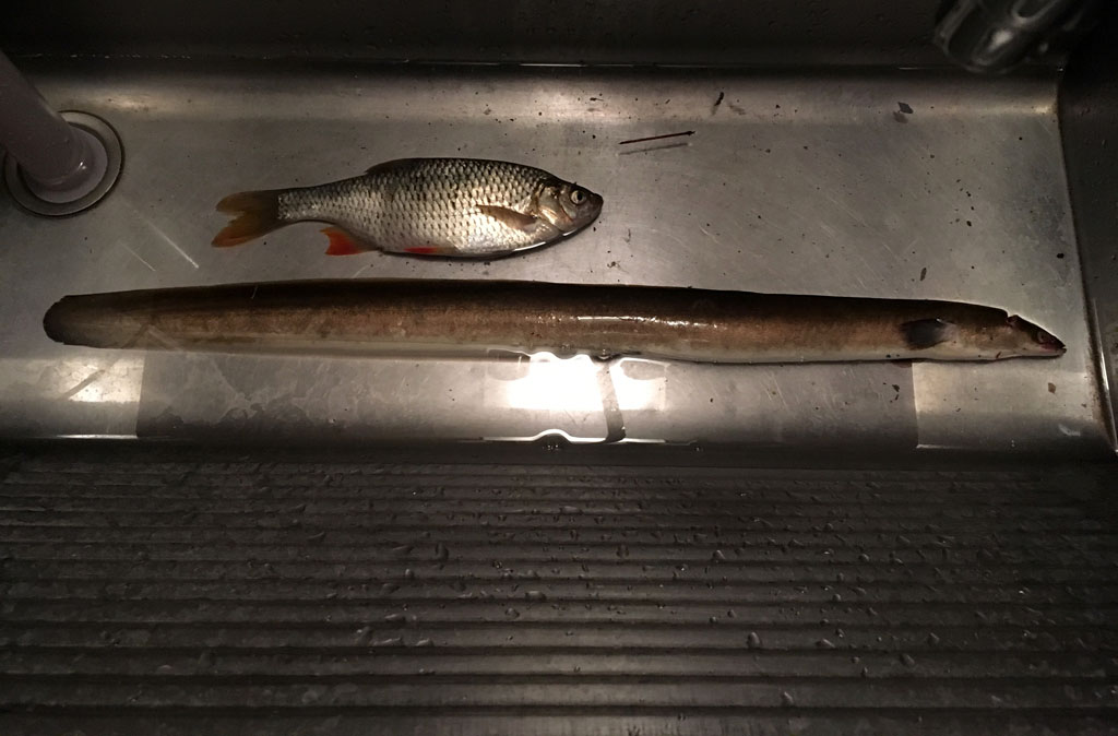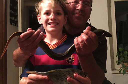 Am 14. und am 18. August ist es dann wieder soweit: Erst soll Mikas neue Angel eingeweiht werden - was sie auch mit 2 schönen Rotfedern dankt. Und dann geht es auf die Jagd nach dem Aal! Den Standort haben Mika und Christian eine Woche vorher beim Nachtschnorcheln ausgekundschaftet. Also Dämmerung abwarten und eine Pose mit viel Wurm und Knicklicht platzieren. Und weil der ideale Platz wieder mal ums Eck ist... richtig: muss Siggi ins Wasser! Geht ja noch, ist nicht tief. Nachdem allerdings der Aal zum ersten mal beisst und den Haken dann im Schilf ausspuckt darf Siggi ordentlich reinwaten - und das gleich 2 mal, denn dem Aal gefällt dieses Spiel! Beim dritten mal hakt er dann aber doch und der erste Aal wird angelandet - hurra!