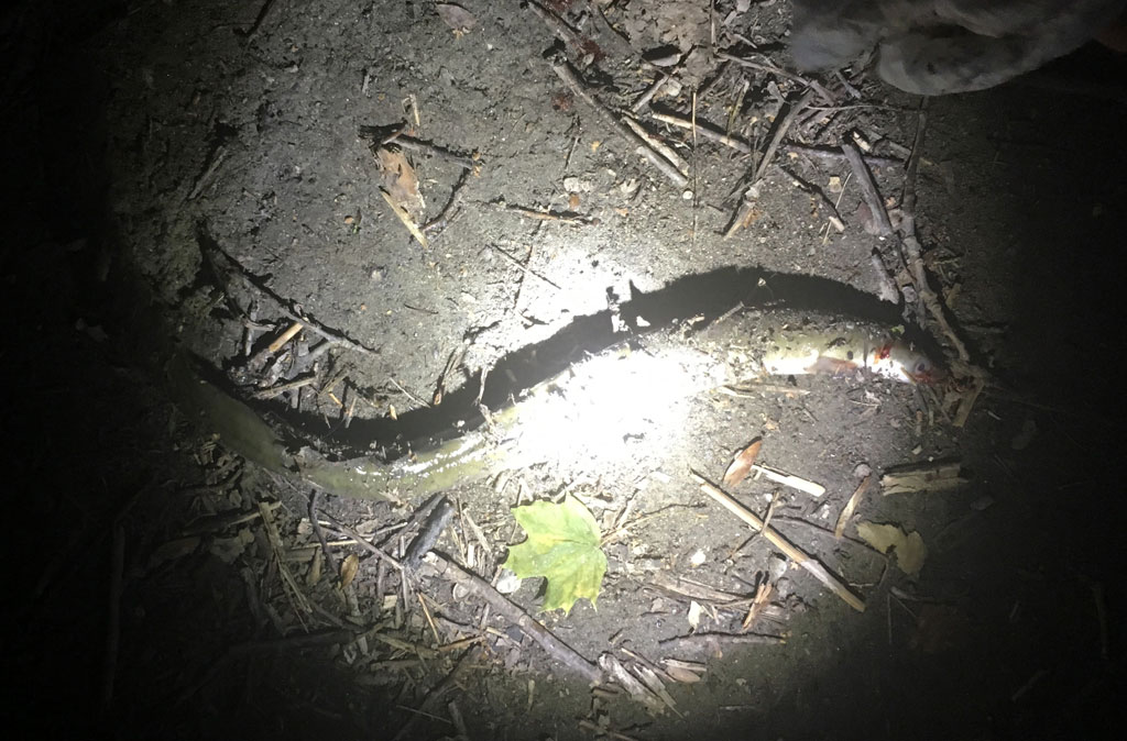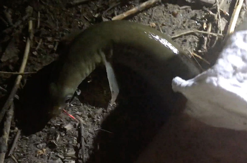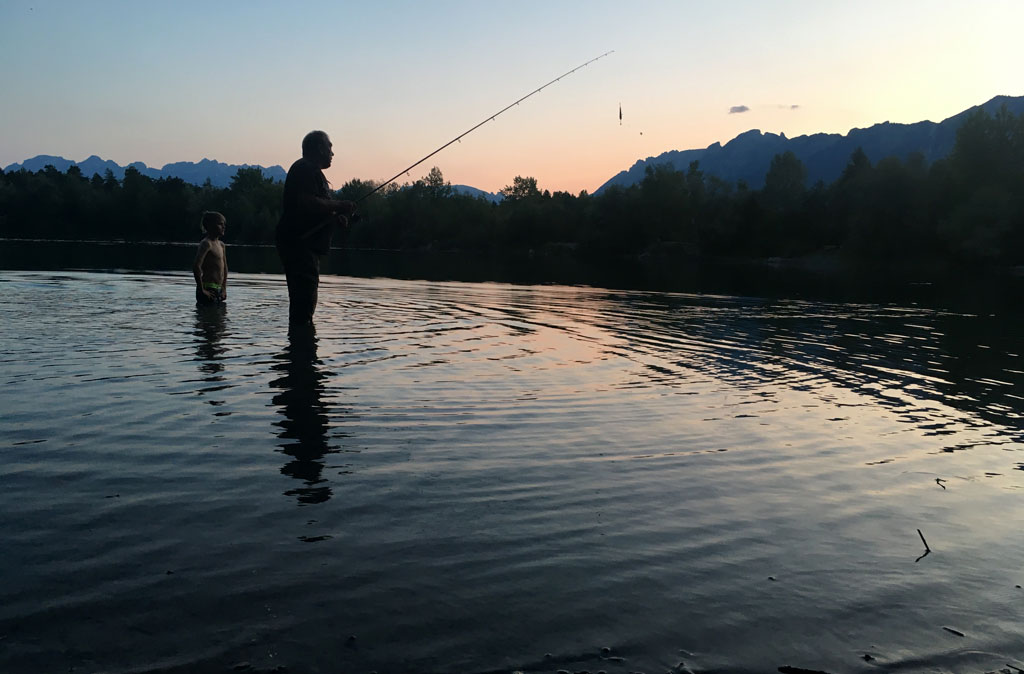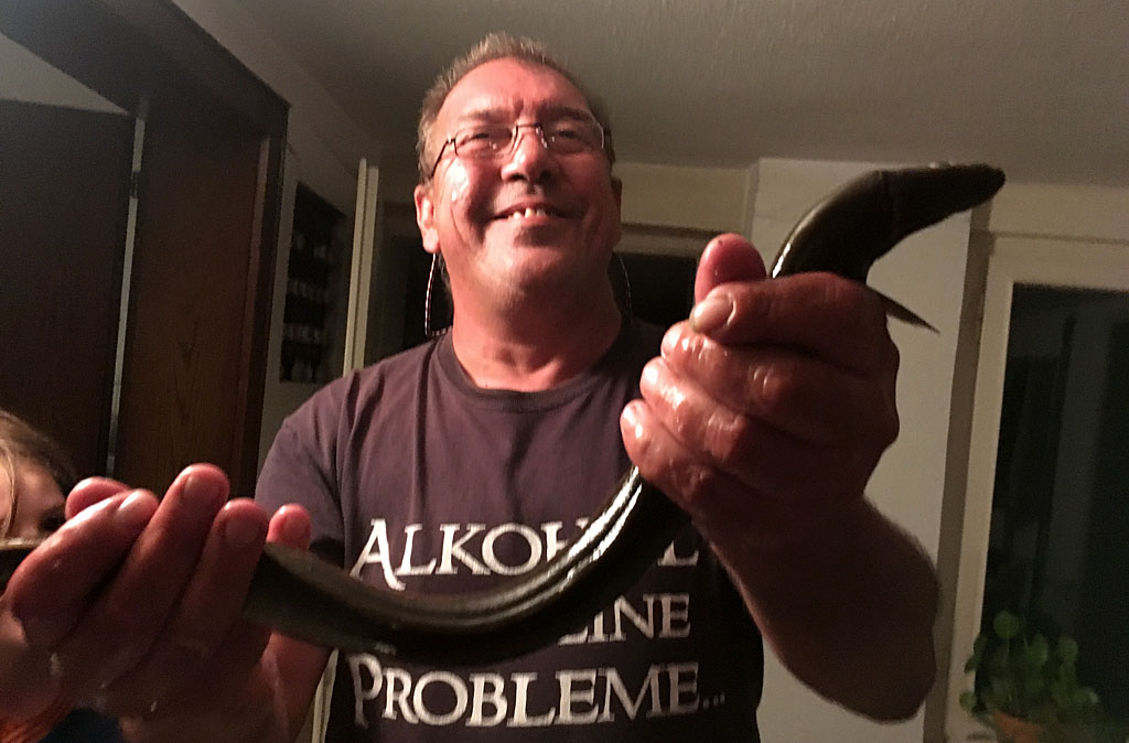 Am 14. und am 18. August ist es dann wieder soweit: Erst soll Mikas neue Angel eingeweiht werden - was sie auch mit 2 schönen Rotfedern dankt. Und dann geht es auf die Jagd nach dem Aal! Den Standort haben Mika und Christian eine Woche vorher beim Nachtschnorcheln ausgekundschaftet. Also Dämmerung abwarten und eine Pose mit viel Wurm und Knicklicht platzieren. Und weil der ideale Platz wieder mal ums Eck ist... richtig: muss Siggi ins Wasser! Geht ja noch, ist nicht tief. Nachdem allerdings der Aal zum ersten mal beisst und den Haken dann im Schilf ausspuckt darf Siggi ordentlich reinwaten - und das gleich 2 mal, denn dem Aal gefällt dieses Spiel! Beim dritten mal hakt er dann aber doch und der erste Aal wird angelandet - hurra!