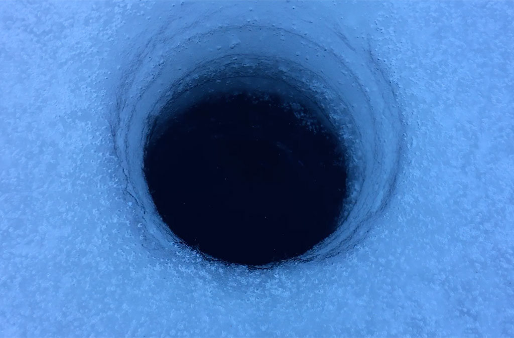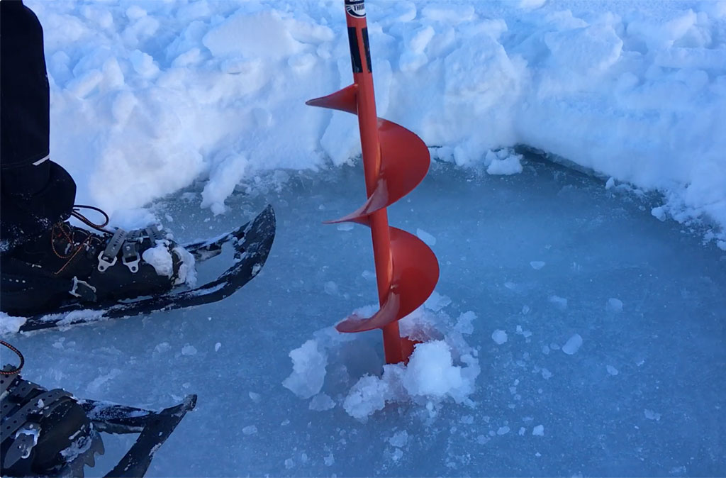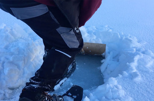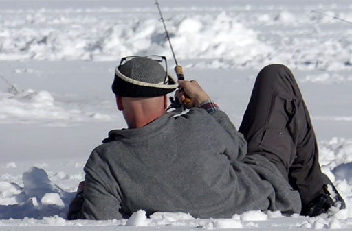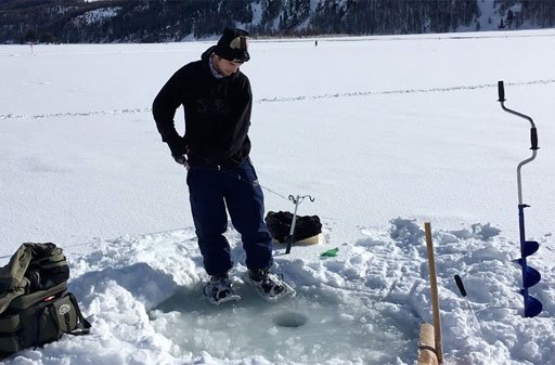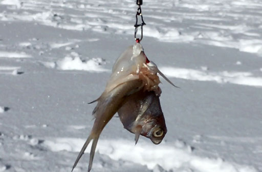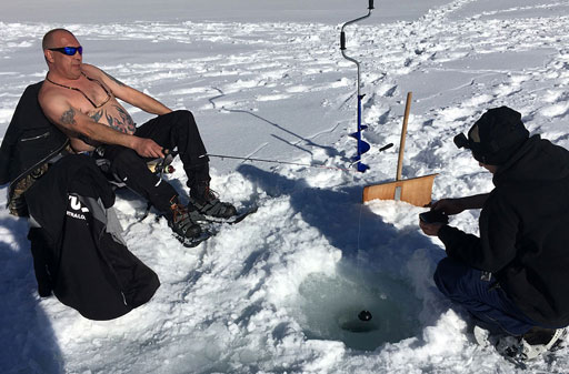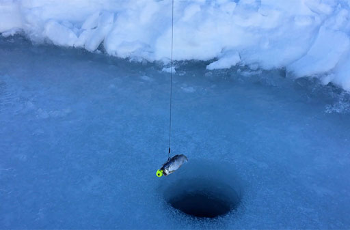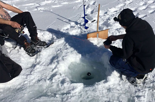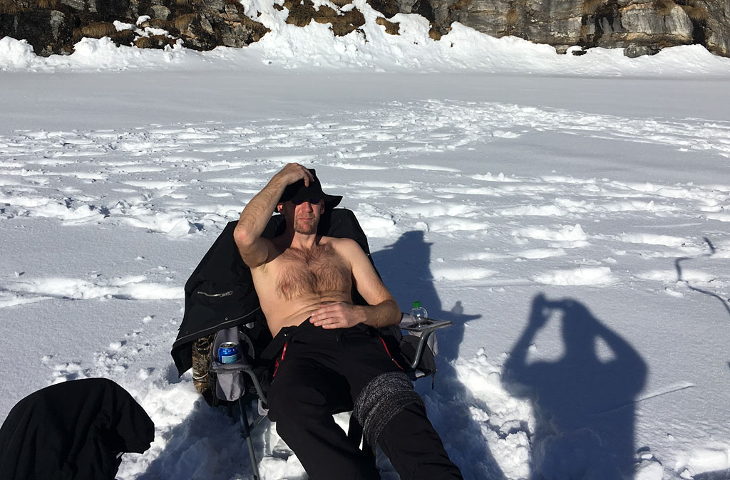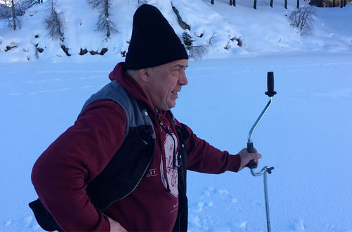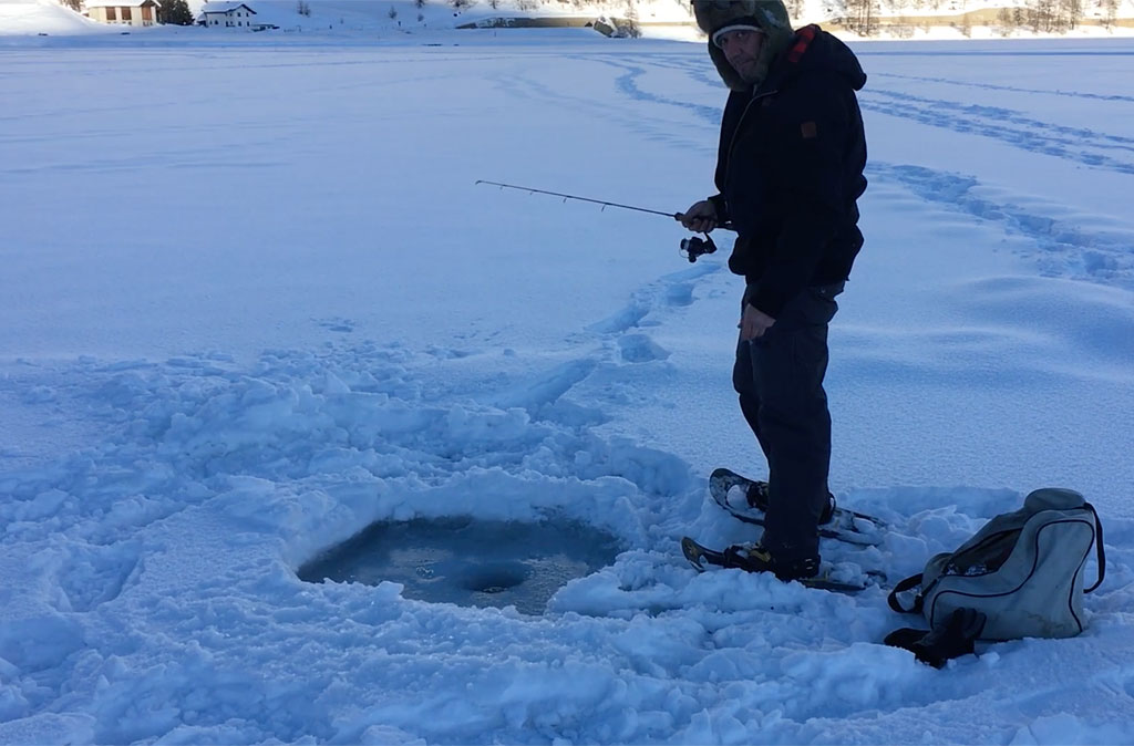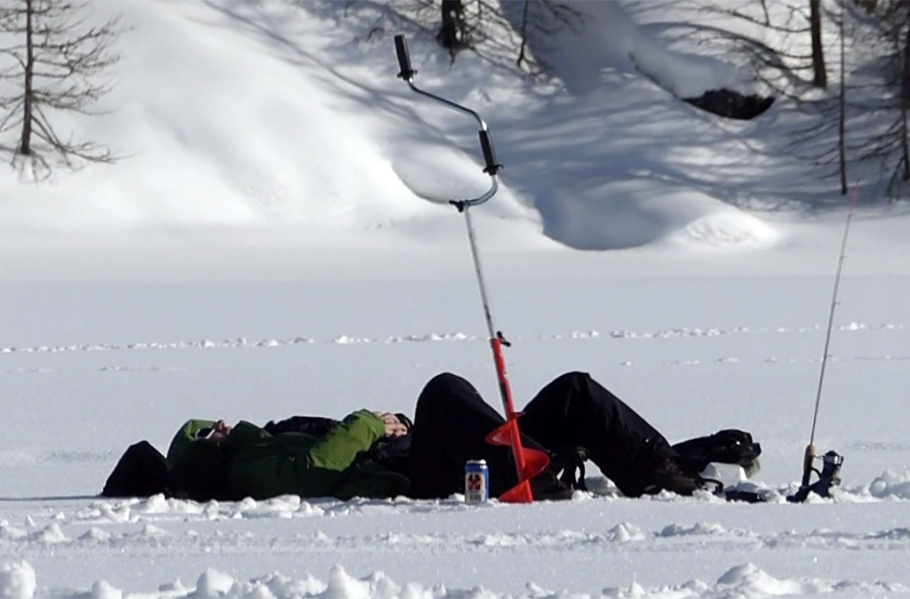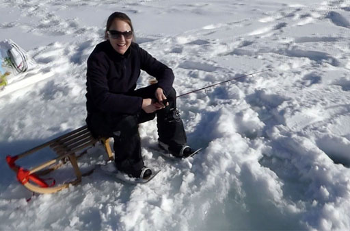 Der See schön gefroren und mit Schneedecke, das Wetter ein Traum - so präsentiert sich uns das Ziel kurz vor Sonnenaufgang, nachdem wir schon nachts um 5 losgefahren sind. Also Schneeschuhe an und raus aufs Eis, wo gleich fleissig Löcher gebohrt und Angeln gerichtet werden. Doch auch wenn es im Verlaufe des Tages immer wieder mal zu einem Biss kommt, so kann doch leider kein einziger Fisch gehakt oder gar gelandet werden. Trotzdem: ein wundervoller Tag an einem wunderschönen See!